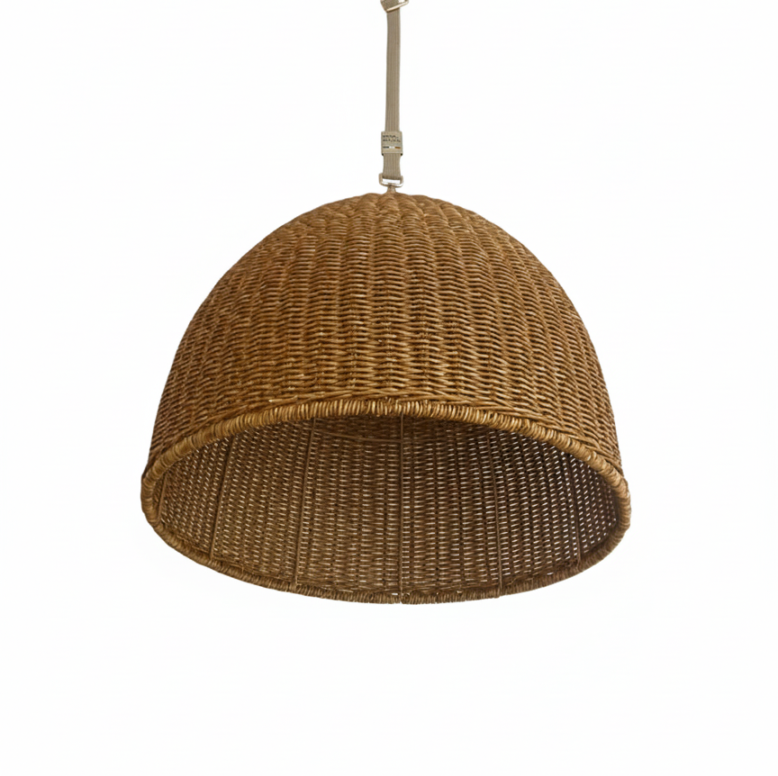 Abat-jour en polyrotin tressé au style naturel et chaleureux. Diffuse une lumière douce avec un jeu d’ombres subtil.