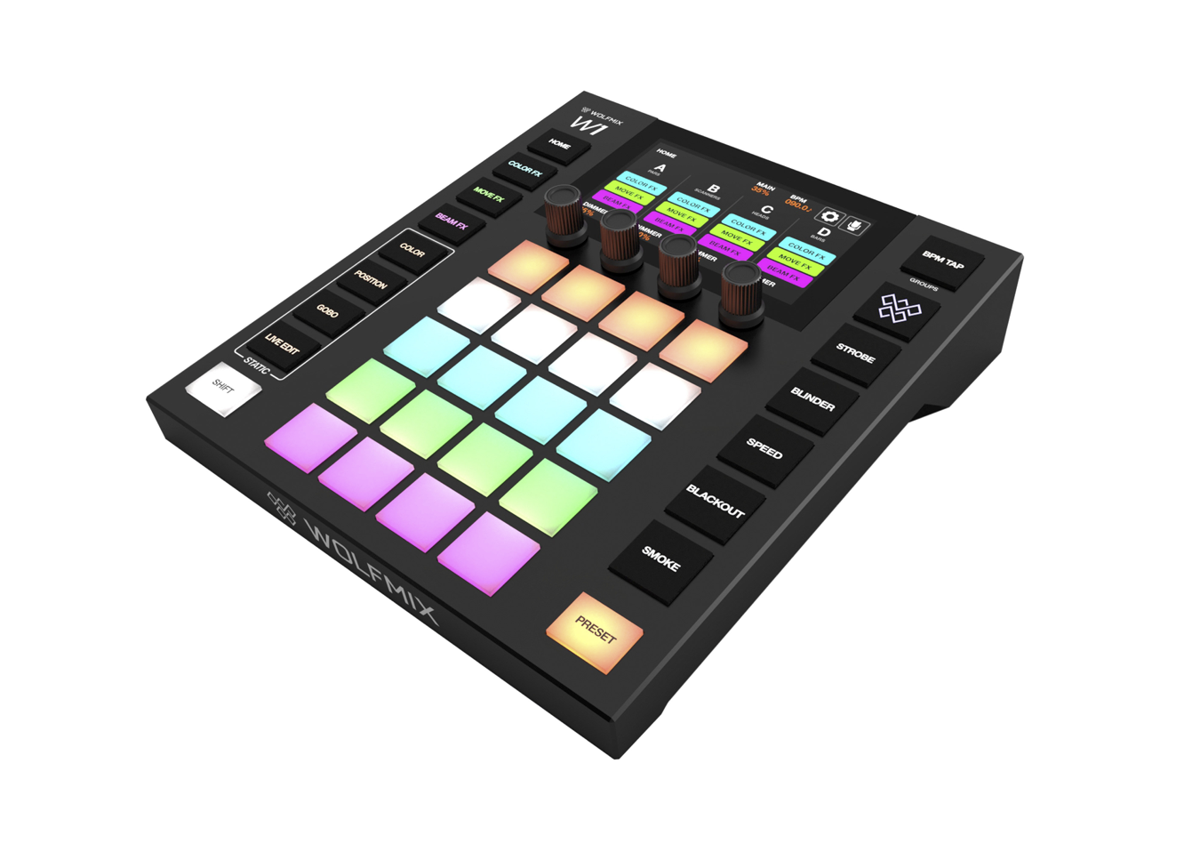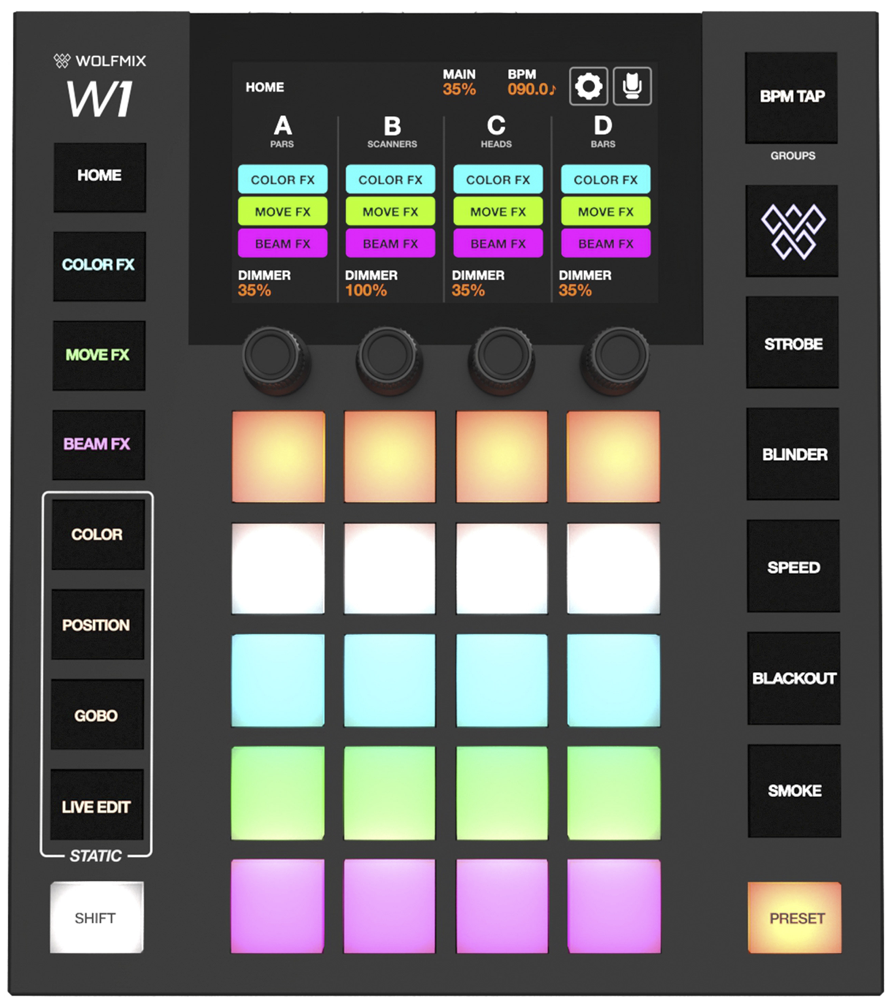 Le WOLFMIX W1 MK2 est un contrôleur lumière DMX autonome, conçu pour créer et piloter un show lumière sans ordinateur.