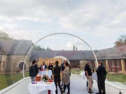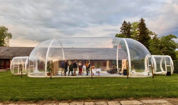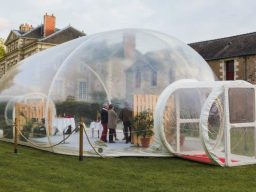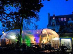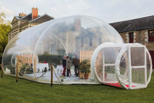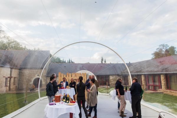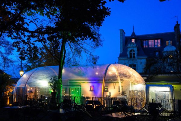Structure transparente offrant un espace événementiel couvert et immersif, adaptée aux mariages et événements d’entreprise.