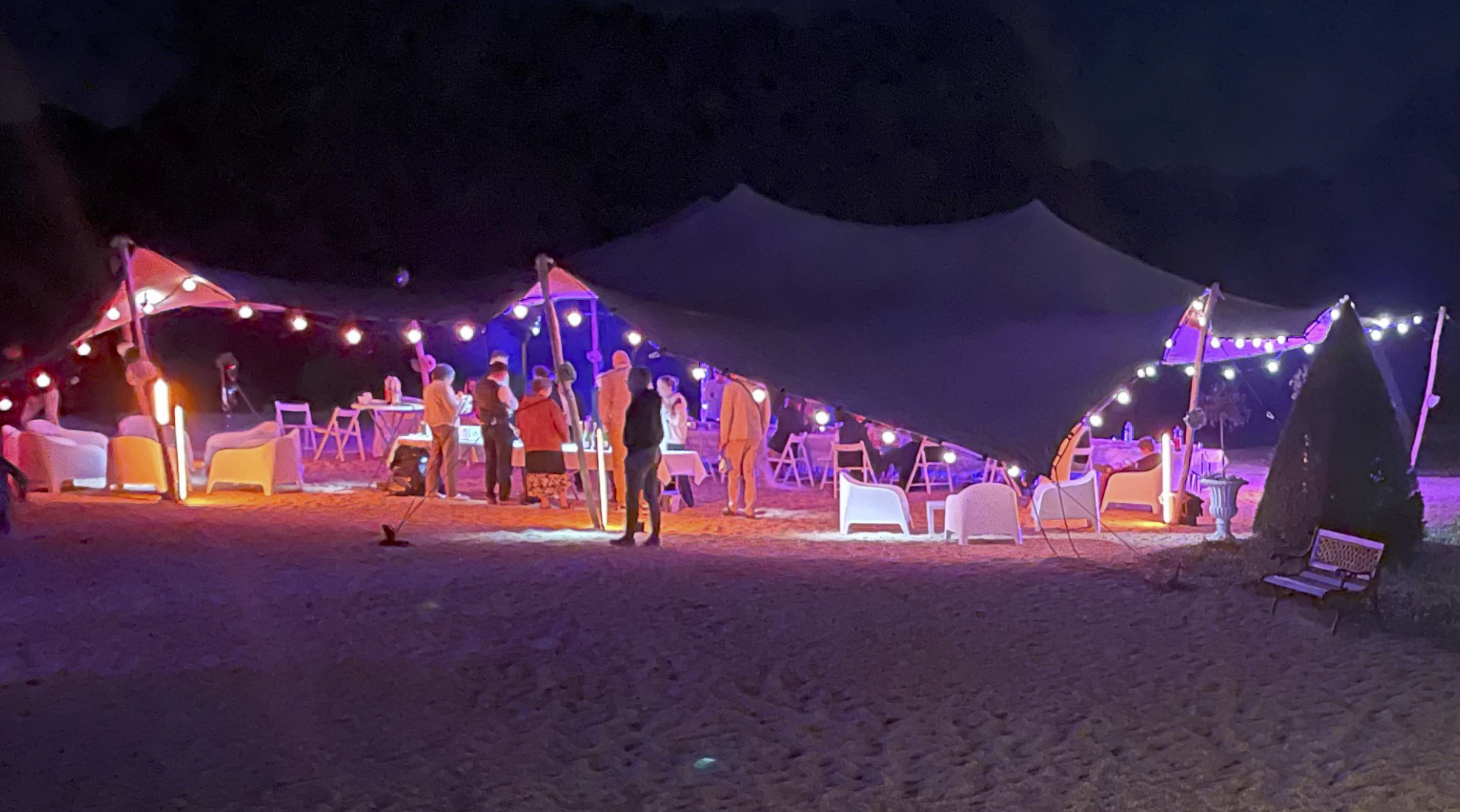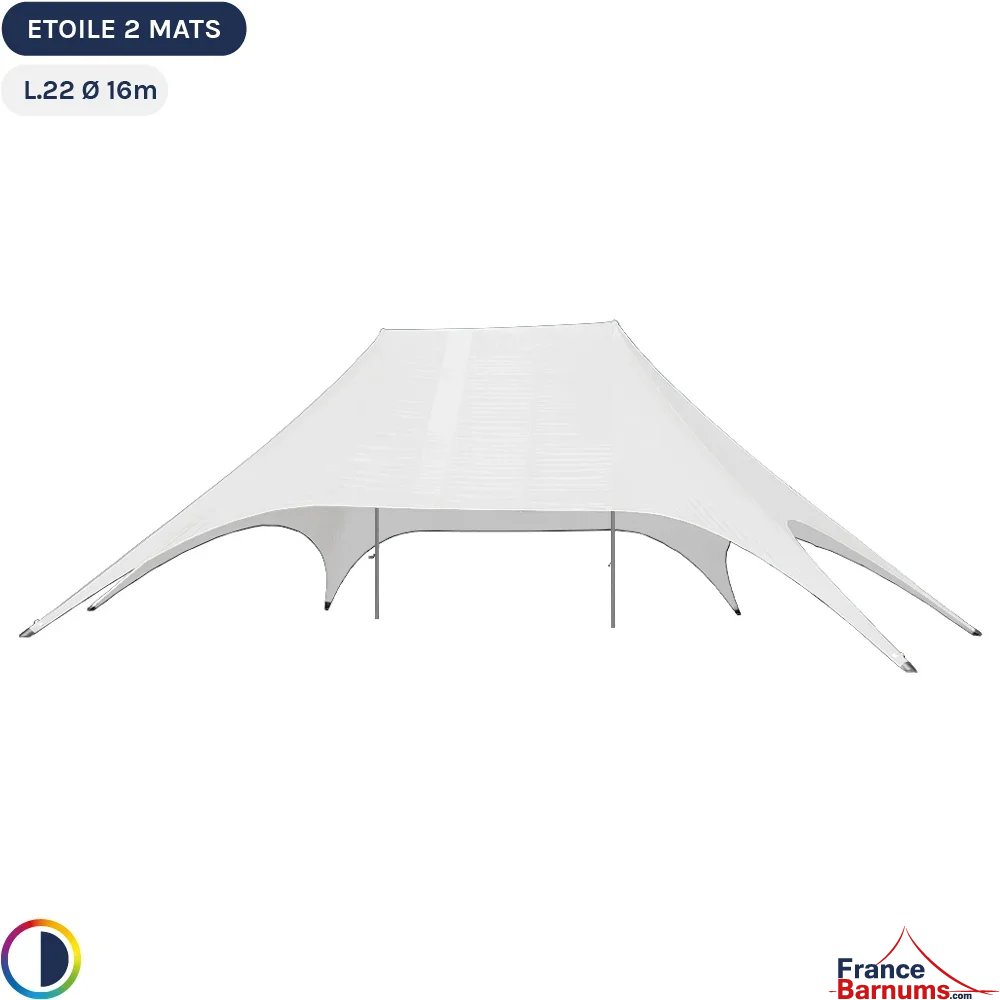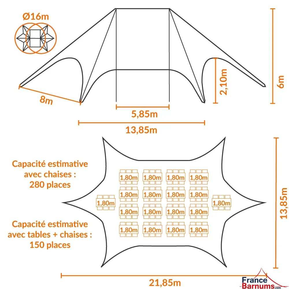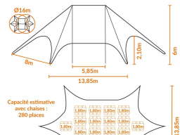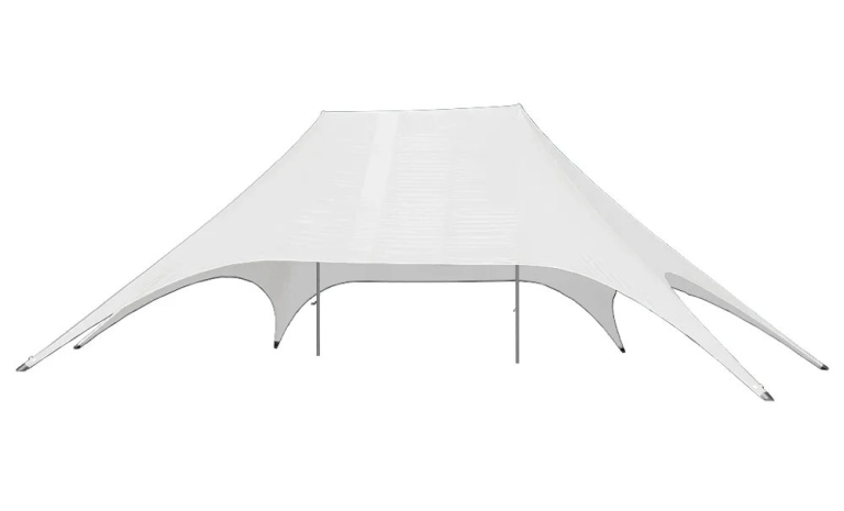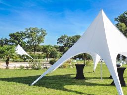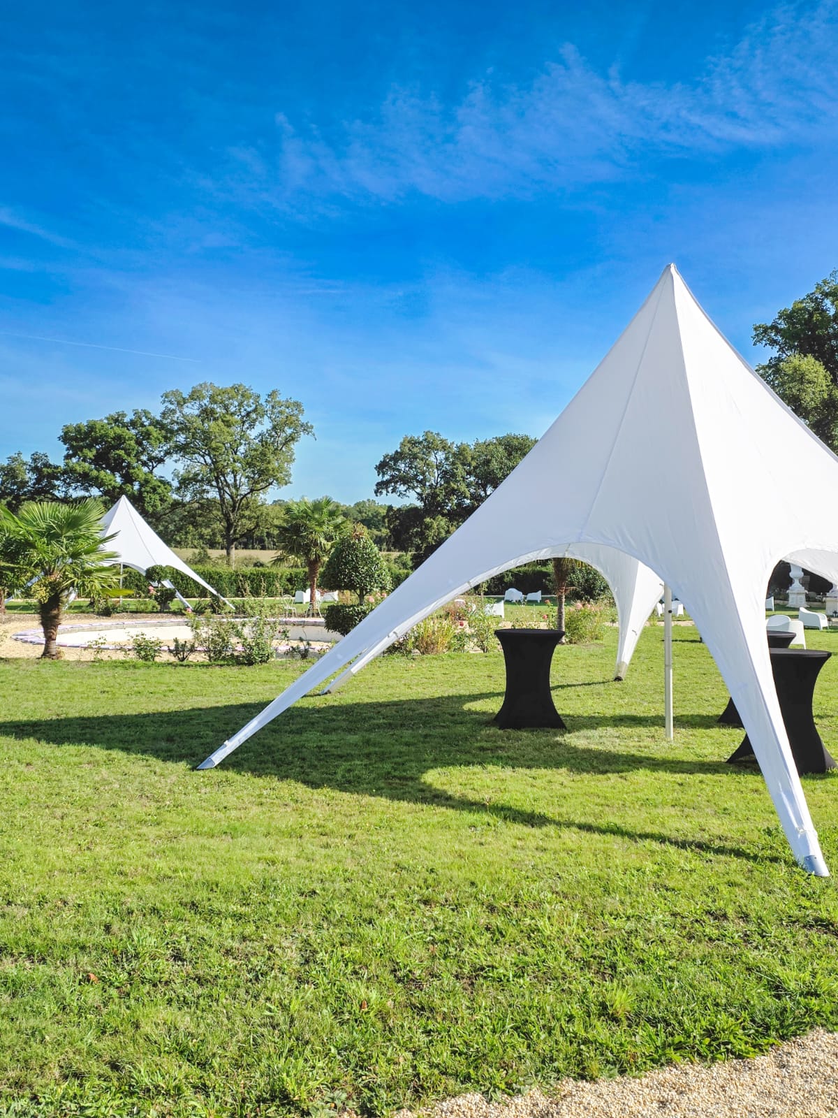 Sa forme étoile et sa toile blanche créent une ambiance élégante et lumineuse pour mariages, cocktails ou événements d’entreprise.