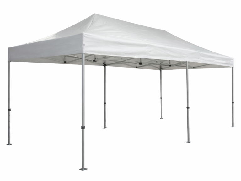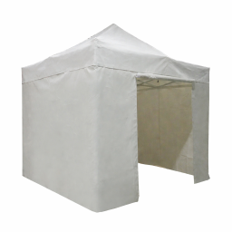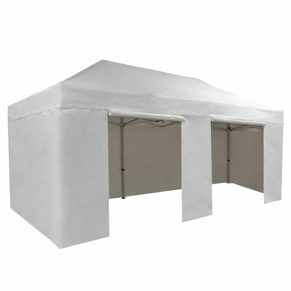 La toile de toit en polyester 320 g/m² enduit PVC garantit une protection efficace contre la pluie et les UV. Le pack 4 côtés inclus permet une fermeture complète du barnum, idéale pour sécuriser un stand, protéger du vent ou créer un espace fermé lors de réceptions et événements professionnels.