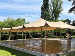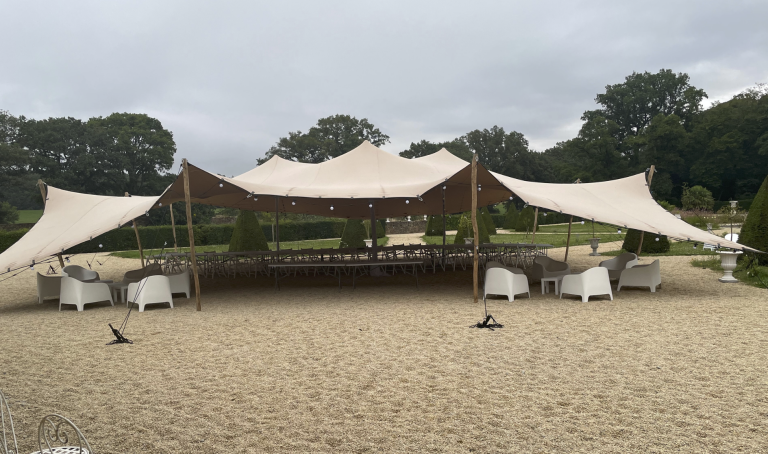 Son design aérien et sa toile blanche apportent une ambiance lumineuse et raffinée, parfaite pour mariages, cocktails, garden-party ou événements d’entreprise.